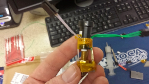 Since now I know where the problem lies, I had to figure out how these extruders work, being that this is all new to me. It turns out they are very simple devices. A hollow nozzle made of brass, with a milled aluminum block to conduct heat, and a 6.8 ohm resistor that does the actual heating. A 100k ohm thermistor provides the temperature measurement. It's all held together with some sort of high temperature putty and kapton tape.