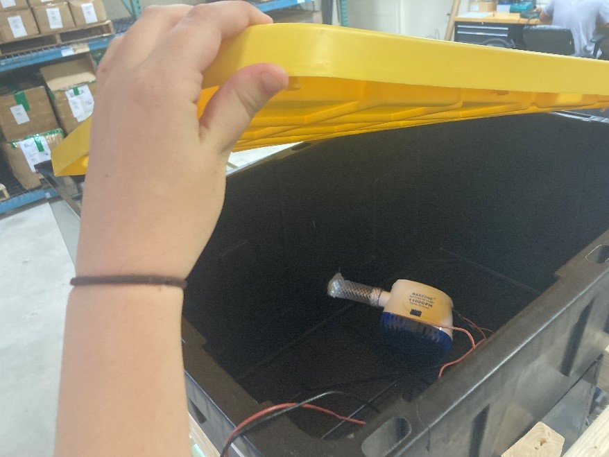 The initial set up of the project included a box leveled on top of the tank, in which a second bilge pump and tube entered and exited the box.