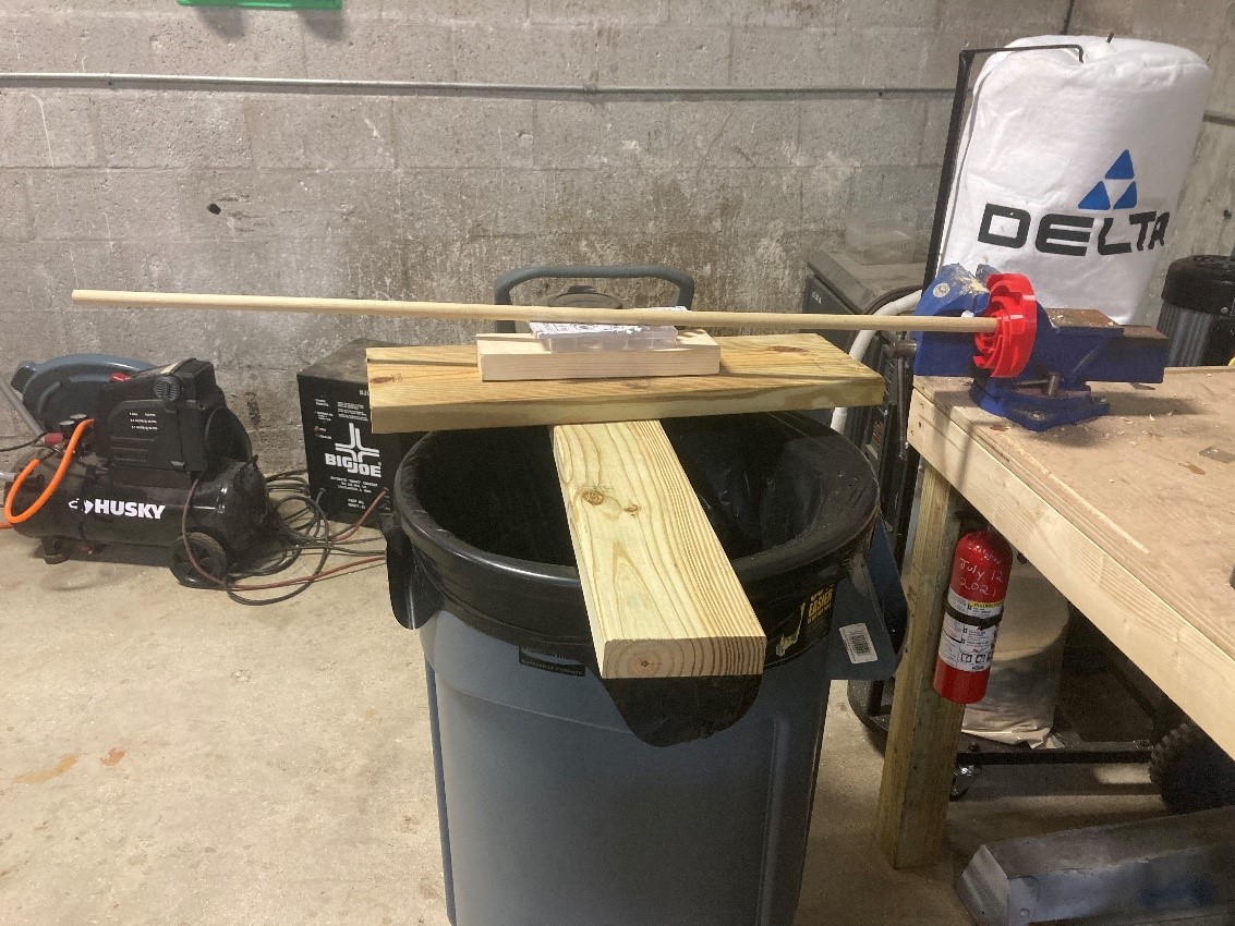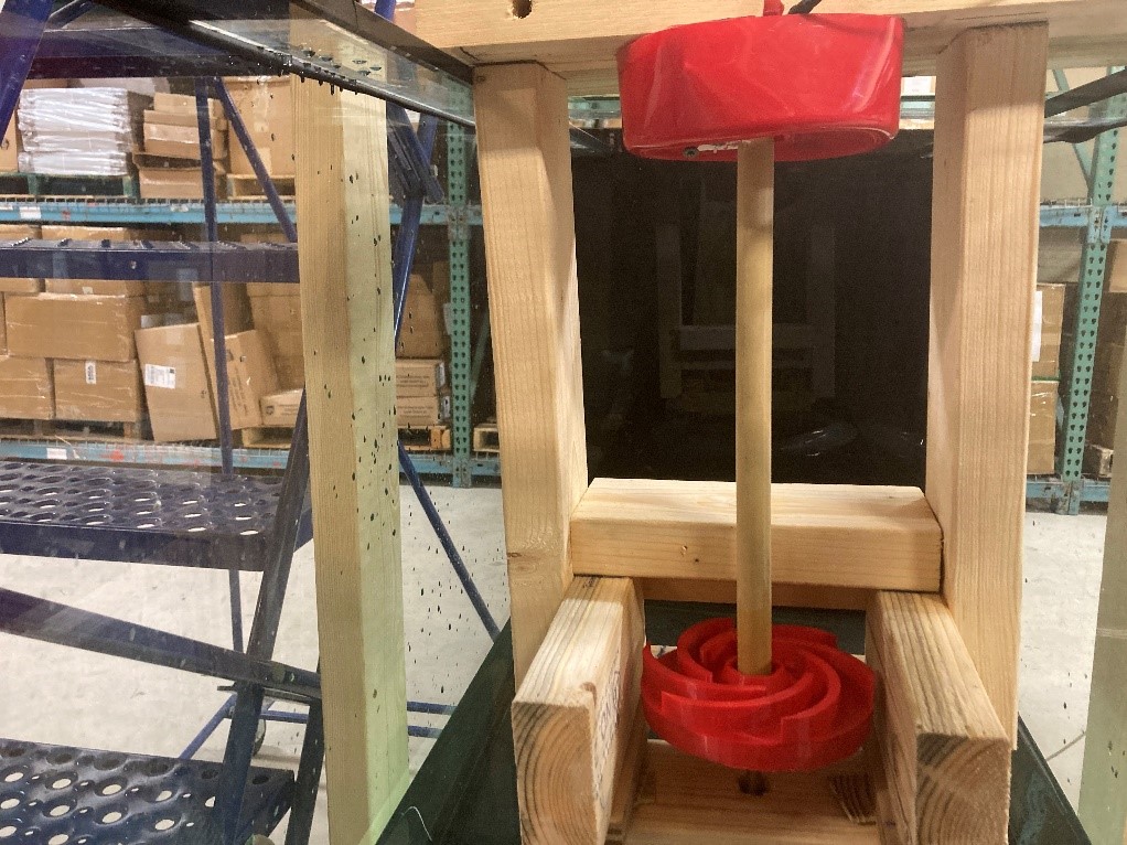 Unfortunately, due to the epoxy not being hardened, the turbine was unable to be used. Instead of attempting twice with the epoxy, Carmen and Tyler went back to Lowe’s and bought a dowel that perfectly fit the hole of the turbine. Tyler then hammered the dowel into the turbine, forcing it create a connected seal.
