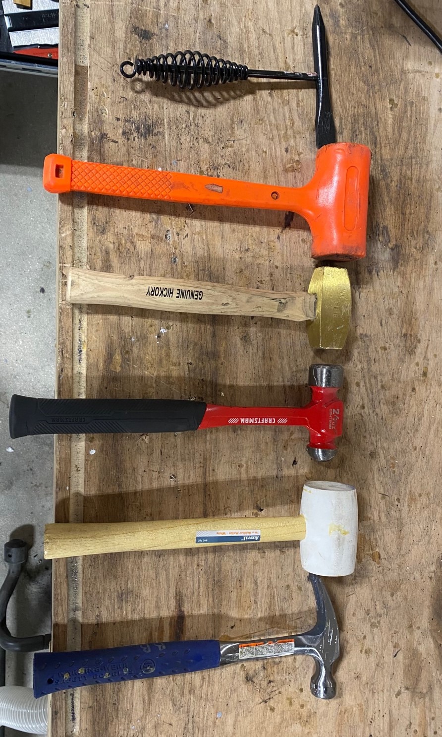 Often people overlook the simple hammer and go off the method of the closest tool is a hammer. Not only can this damage tools it can sometimes unnecessarily cause damage to the thing you’re working on. By selecting the correct hammer for the job not only can you make your like easier, but you can also cause less wear on the parts you’re working on. From left to right in the above picture the hammer types are as follows: Slag, dead-blow, brass sledge, ball-peen, rubber mallet, and claw framing hammer.